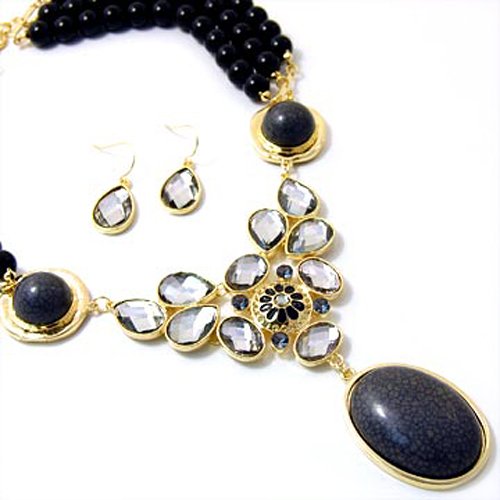 Buy Goldtone Black Pearl and Crystal Statement Necklace and Earrings Set